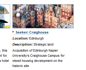 According to an article last year in Property Week, the acquisition of the Napier Craighouse campus was part of a wider land purchase initiative being undertaken by Mountgrange, called Project Seeker [free registration required to read this link]. Mountgrange is said to be working with “strategic land firm LA&P“.